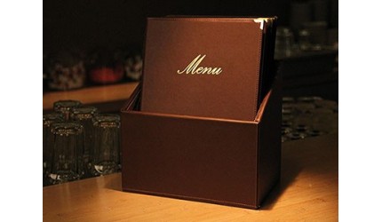 Set of communications solutions for cafes, hotels and restaurants. Menu protectors for restaurants, menu holders. Slate for restaurants. Table set, candles for restaurant.