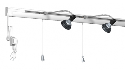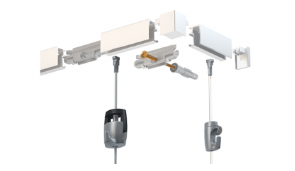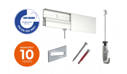 Offered in kit or pack including rail, fixing, perlon cables or steel cables and also suspension hook.