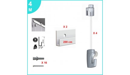 un pack cimaise complet est une solution clé en main pour la fixation de tableaux, il inclut tout ce dont vous avez besoin pour installer les cimaises : les rails, les fixations pour les rails (clips, vis et chevilles), les câbles perlon de 150 cm et les crochets pour tableaux.