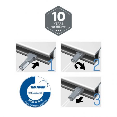 Grâce à sa capacité de charge maximale de 20 kg, le Câble Perlon Twister assure une suspension stable et sécurisée. Il supporte sans risque des objets lourds et volumineux, garantissant la pérennité de votre installation. Son embout Twister innovant permet une insertion et un retrait rapides à tout moment sur le rail de cimaise, sans nécessiter d'outils ni de démontage, ce qui facilite la maintenance et la réorganisation des supports suspendus.