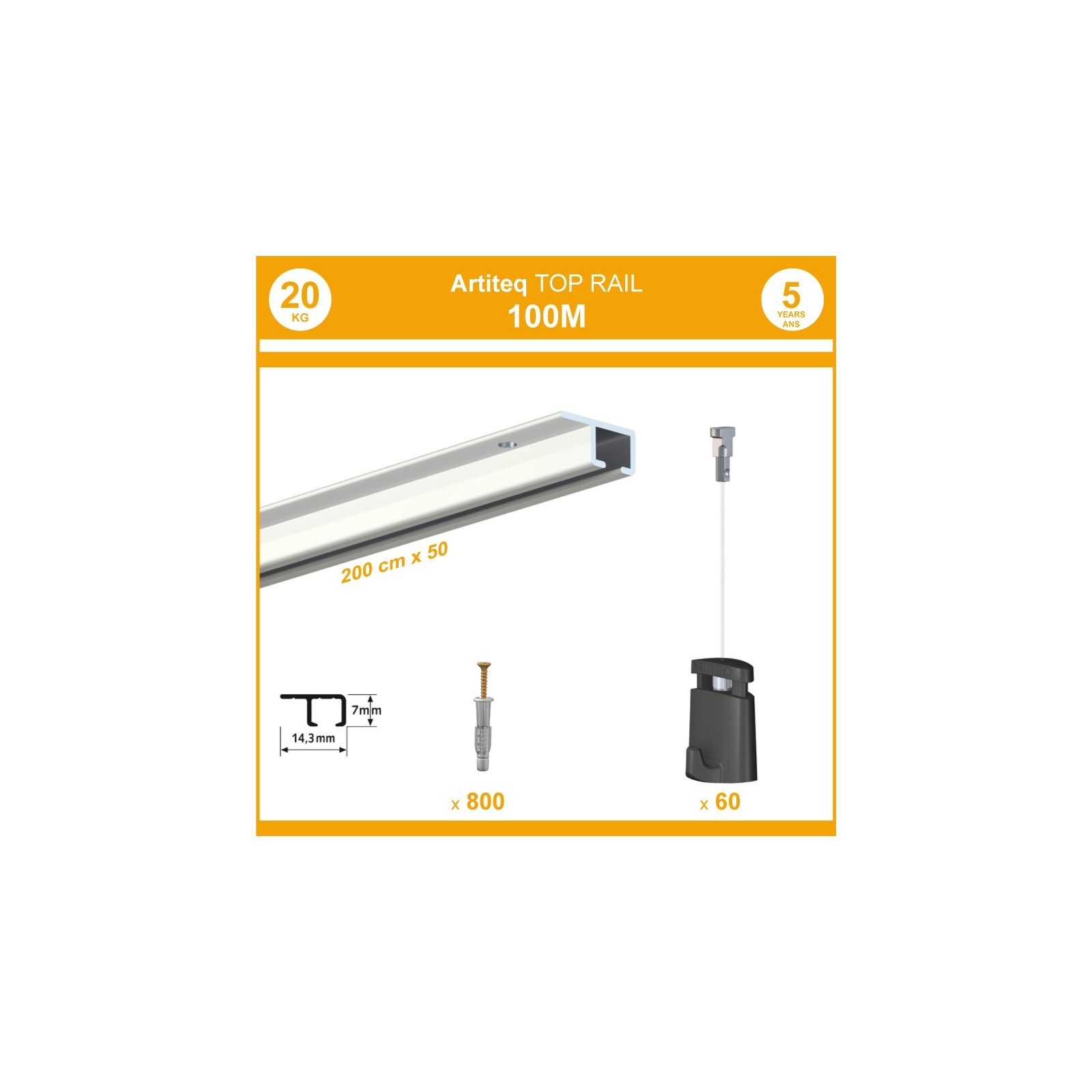 Ce pack complet comprend 100 mètres de rail découpés en 50 sections de 2 mètres, accompagnés de 800 vis et chevilles pour une fixation solide et durable. Les câbles Micro perlon transparents, d'un diamètre de 1 mm, sont équipés d'embouts Twister qui permettent une insertion à n'importe quel endroit du rail, offrant une grande flexibilité d'accrochage. Chaque câble supporte jusqu'à 5 kg, idéal pour suspendre des cadres légers à moyens.