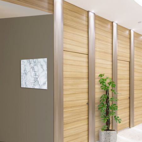 Le pictogramme toilettes PMR est imprimé en numérique UV haute qualité, garantissant des couleurs durables et un rendu précis. La texture marbre blanc apporte une touche élégante et moderne, valorisant la signalétique de votre établissement tout en respectant les normes d’accessibilité visuelle.