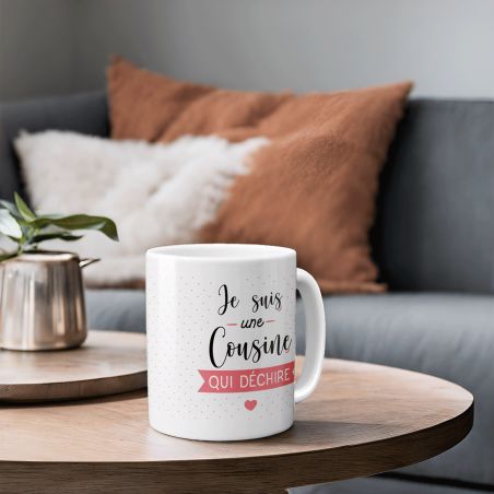 Le message "Je suis une cousine qui déchire" est imprimé avec soin pour ne pas s'effacer, même après un usage intensif. Ce mug est conçu pour accompagner votre cousine au quotidien, que ce soit au bureau, à la maison ou en déplacement.
