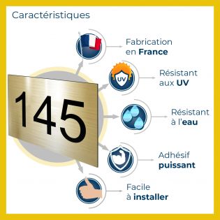 Chaque plaque est équipée d’un adhésif 3M de haute qualité, reconnu pour sa tenue exceptionnelle sur de nombreuses surfaces. Cette fixation autocollante permet une pose facile et rapide, sans nécessiter d’outils ni de perçage. Vous pouvez ainsi installer votre numéro en quelques minutes, en toute sécurité et avec un rendu professionnel.